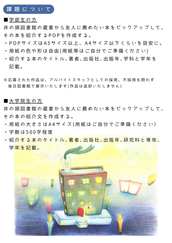 ※応募された作品は、アルバイトスタッフとしての採用、不採用を問わず後日図書館で展示いたします(作品は返却いたしません)