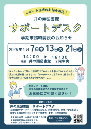 学期末のレポート作成、実習の事前準備などでお困りのことがあれば気軽にお問い合わせください。